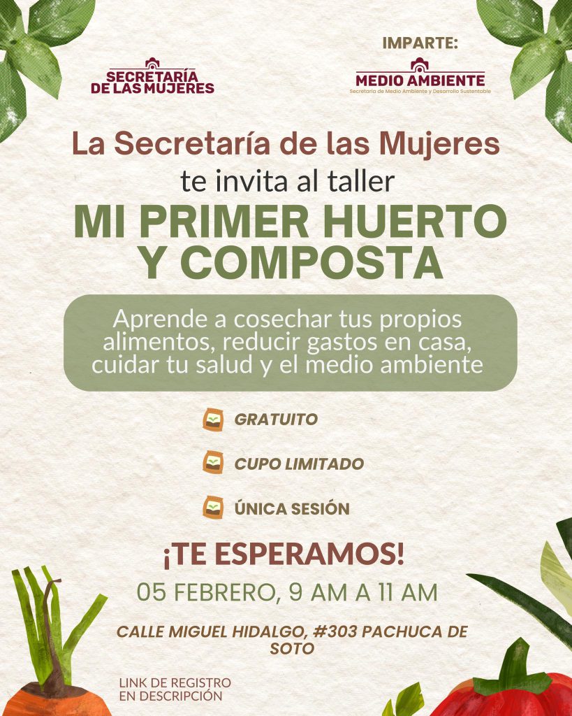 La Secretaría de las Mujeres de Pachuca, en coordinación con la Secretaría de Medio Ambiente y Desarrollo Sustentable, lanzó la invitación al taller “Mi primer huerto y composta”, una actividad práctica orientada a aprender a cultivar alimentos, reducir gastos en casa y cuidar la salud y el medio ambiente.