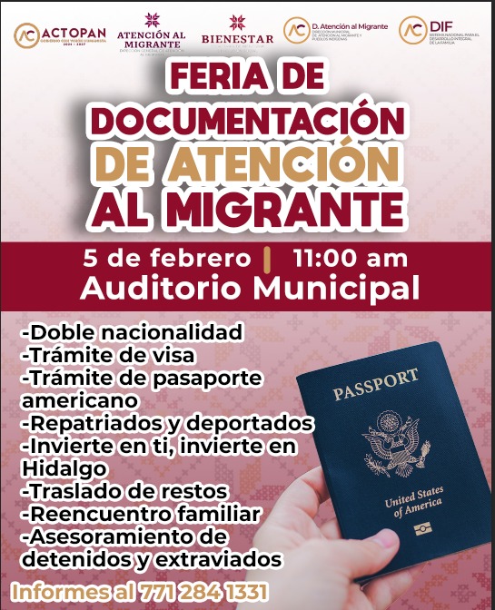 Quienes enfrentan dudas o trámites en materia migratoria tendrán un punto de apoyo este 5 de febrero, cuando se lleve a cabo la Feria de Documentación de Atención al Migrante en el Auditorio Municipal de Actopan, a partir de las 11:00 horas.