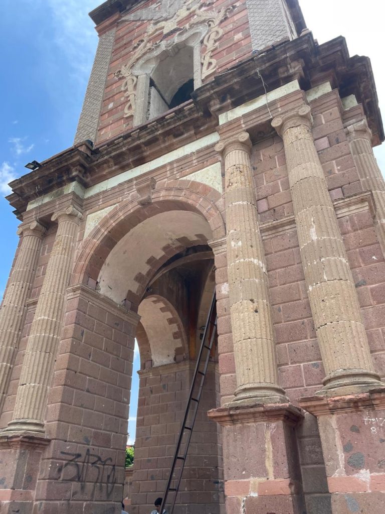 Uno de los puntos clave fue la restauración del torreón del Reloj Monumental, donde se realizó una limpieza intensiva, retiro de vegetación invasiva, eliminación de grafitis y aplicación de aplanados tradicionales con mezcla de baba de nopal, cal apagada, cloro y agua. Posteriormente, se aplicó un acabado en tonalidad naranja y se pulió con piedra obsidiana.