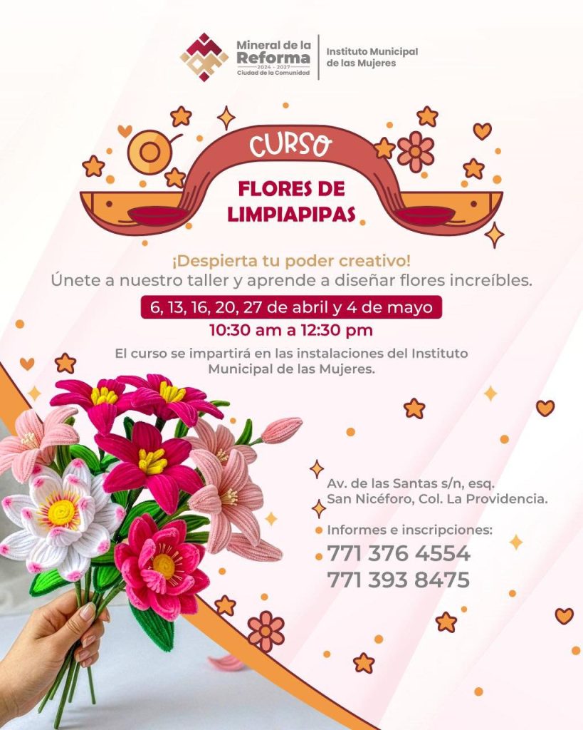 El Instituto Municipal de las Mujeres de Mineral de la Reforma lanzó una invitación abierta para participar en el curso de flores de limpiapipas, un taller diseñado para desarrollar habilidades creativas, fomentar la convivencia y abrir espacios de expresión artística.